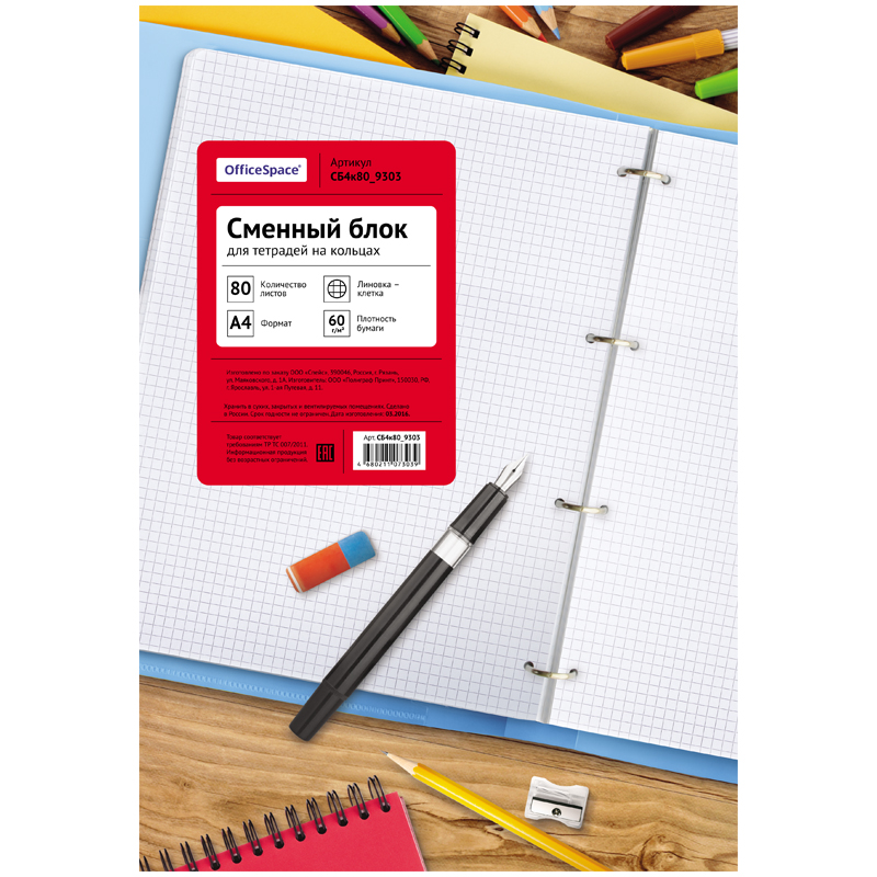 Сменный блок для тетрадей с кольцевыми механизмами. Формат А4, 80 листов. Белая офсетная бумага плотность 60 г/м? в клетку, без полей. Упакован в термоусадочную пленку с полноцветной картонной этикеткой.
